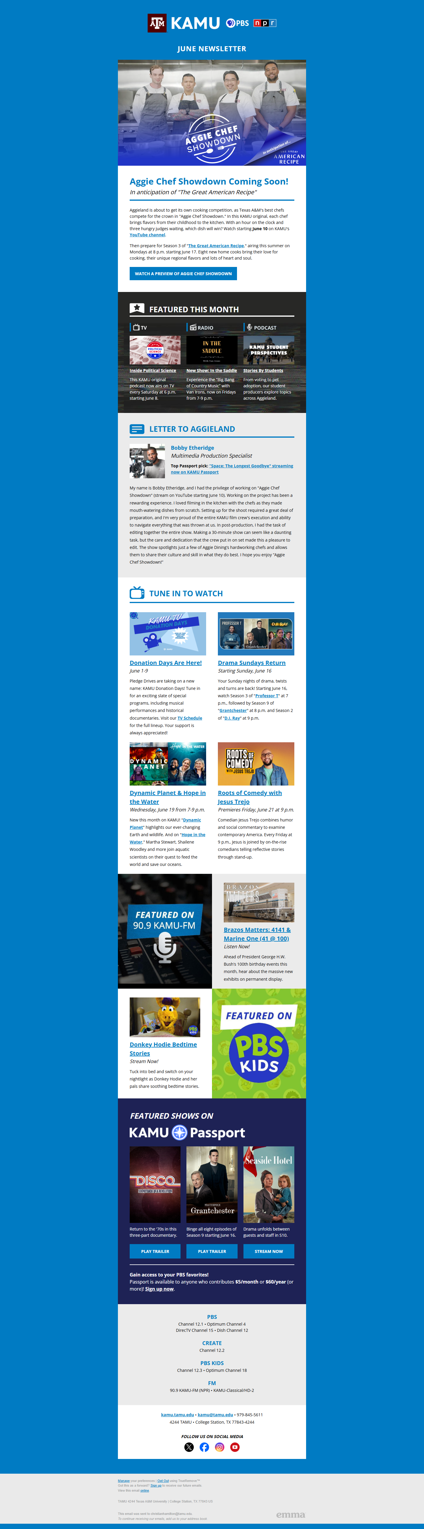 "Texas A&M Today" is the project I was originally hired for - a show all about creative storytelling and dynamic cinematography. I joined the team midway through production of the first season. The show was not in good shape, in need of organization, fact-checking and improved communication. I got the first season over the finish line in about five months, then immediately started production on Season 2, which we wrapped in nine months.